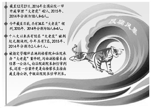 记者梳理发现,今年截至12月27日,全国法院共一审开庭审理“大老虎”42人,2015年一审开庭审理18人,2014年一审开庭审理6人,今年审理“大老虎”数量再创新高。