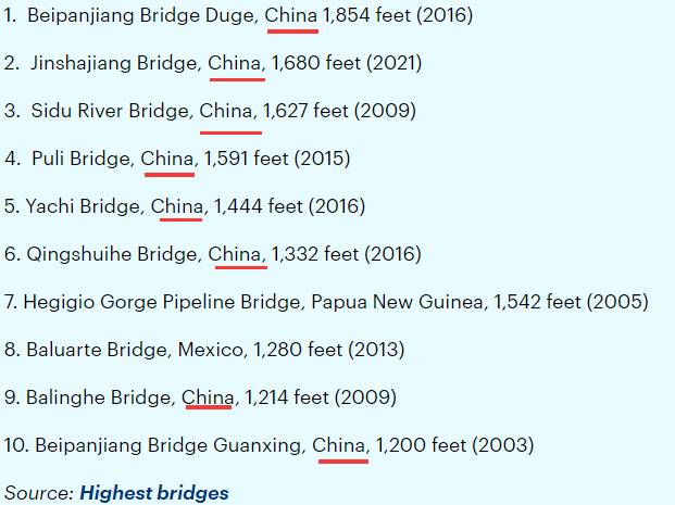 事实上,在10座世界最高的大桥名单当中,除了第七(位于巴布亚新几内亚)和第八(位于墨西哥)外,其余八座桥梁都来自中国!