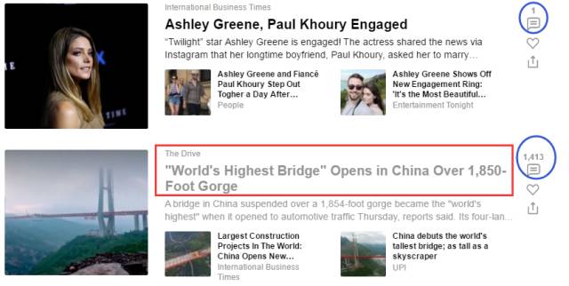 在门户网站雅虎上,有关北盘江大桥的新闻评论数量高达1405条,这一评论数量在该网站算得上是最多的级别了!通常只有明星八卦之类的新闻,才会有这么多人关注。