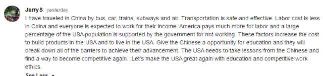 我在中国旅行,坐过巴士、小轿车、火车、地铁、飞机等等所有交通工具。中国的交通安全而且高效,在中国人力成本很低,而且每个人都希望通过自己的工作和努力赚取收入。但在美国不同,美国人力成本太高,而且美国政府供养了大量不去工作的人,这就大大抬高了同样的工程在美国的建造成本。如果给予中国人更多的教育机会,他们就能够打破所有挡在他们目标前的障碍。美国应当从中国那里学习经验,才能恢复竞争力。美国的强大需要教育以更有效的工作观念。