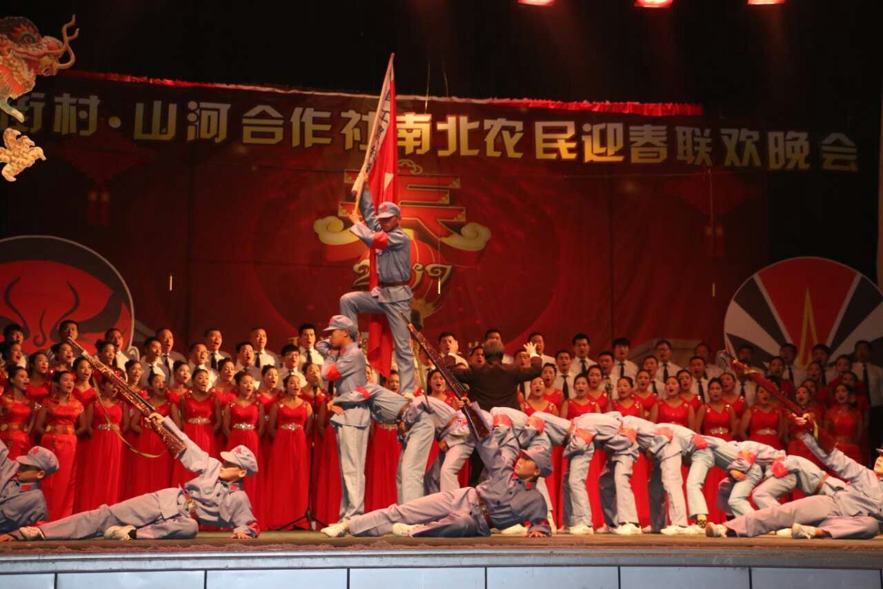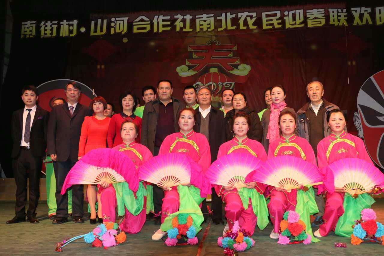联欢会在山河村农民演出队的(东北大秧歌)和南街村艺术团大合唱(南街村之歌)中欢快圆满结束。南街村党委书记王宏斌等领导上台与南北农民全体演员合影留念。山河村李书记和农民演出队再三邀请宏斌书记带南街村农民艺术团到黑龙江畔的逊克县做客。王宏斌书记动情地说,今晚的南北农民联欢会很成功,我们要向逊克县山河村农机合作社同志们学习。明天中午我们邀请你们演出队全体同志共同午餐,共同欢庆2017年新春佳节,也向山河村农民兄弟同志们拜年问好。