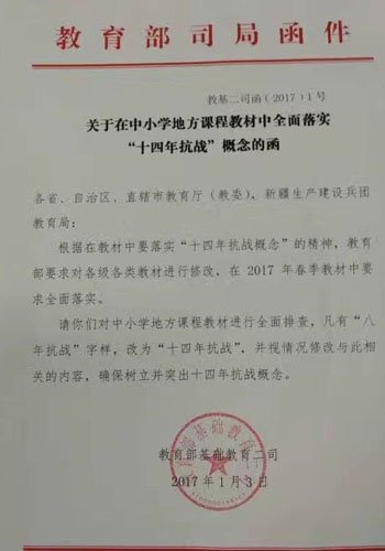 《关于在中小学地方课程教材中全面落实“十四年抗战”概念的函》