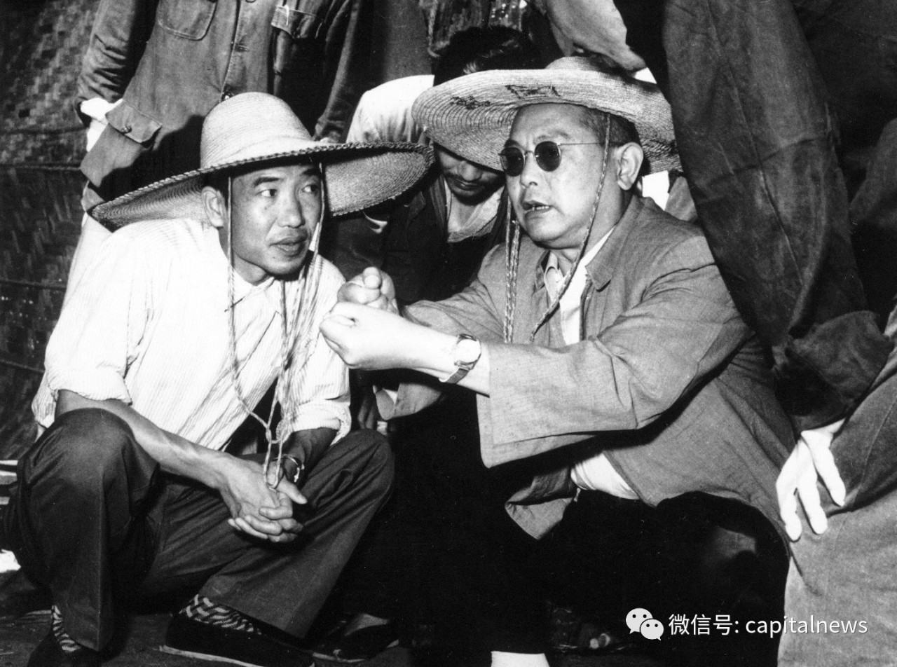 王任重(右一)考察水利建设和乡亲们亲切交谈