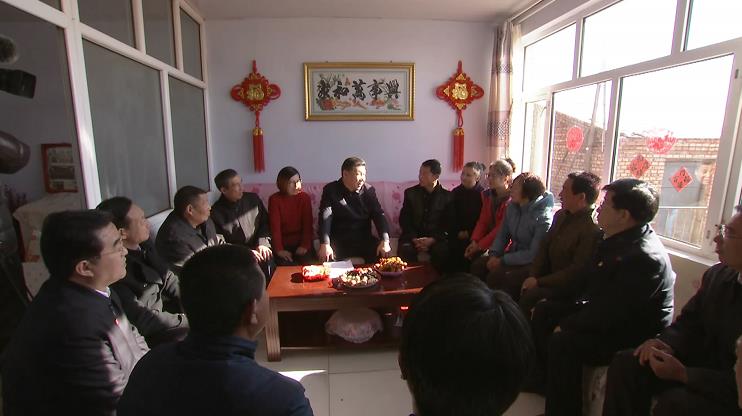 1月24日,中共中央总书记、国家主席、中央军委主席习近平来到河北省张家口市,看望慰问基层干部群众,考察脱贫攻坚工作。这是习近平在张北县小二台镇德胜村看望慰问村民,向乡亲们拜年。新华社记者兰红光摄