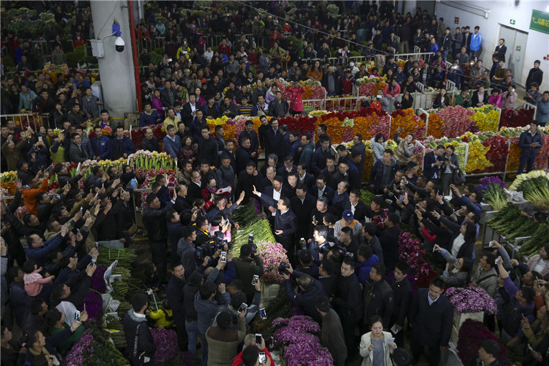 【总理夜访昆明花市:关心起早贪黑的花农】春节将至,昆明斗南花卉市场内鲜花汇成七彩海洋。24日晚,总理意外到访,让这个人头攒动的市场沸腾了。李克强仔细询问鲜花品种价格,关心花农收入,还自掏腰包买了两束花。总理说:“你们起早贪黑、辛苦劳作,给全国人民送去欢乐吉祥。我祝福你们春节快乐!”