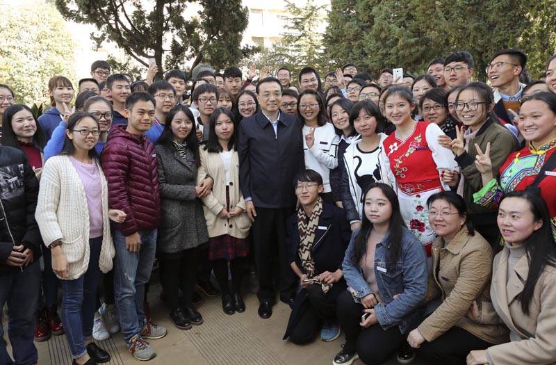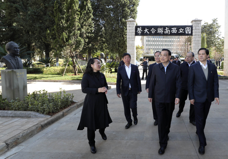 【李克强:你们要将西南联大精神发扬光大】李克强24日来到位于云南师大的西南联大旧址。寒假仍留校的学生们闻讯赶来。总理说,你们现在的教学条件比当年好得多。当年是“物质上得不了,精神上了不得”。希望你们在这里汲取前辈们的精神养分,传承刚毅坚卓的文化品格,将西南联大的精神发扬光大。