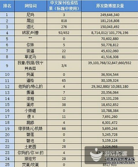 该报告显示,检索中文报刊媒体发现,媒体在标题中使用最多的三个用词是“屌丝”、“逗比”和“叫兽”。