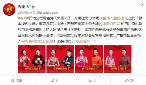其中朱军、董卿、康辉、朱迅、尼格买提,将坐镇春晚主会场与我们共度除夕,迎接新年。四地分会场主持人随后曝光,东部上海分会场为主持人孟盛楠与上海广播电视台主持人曹可凡联袂主持;西部四川凉山分会场杨帆和四川凉山彝族自治州歌舞团主持人阿侯尔里共同搭档,南部广西桂林分会场张蕾和广西电视台主持人高枫携手合作,北部黑龙江哈尔滨分会场管彤和黑龙江广播电视台主持人周巍。