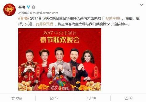 距离2017年央视春晚只有最后2天了,主持人阵容也浮出了水面。13位主持人分别是朱军、董卿、康辉、朱迅、尼格买提、孟盛楠、曹可凡、杨帆、阿侯尔里、张蕾、高枫、管彤、周巍。