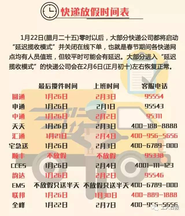 按照惯例,春节期间是无法收发快递的。目前,申通、圆通、中通、百世汇通等多家快递已经陆续开启“过年模式”,多数快递员即将放假,收发快递将会受到影响。顺丰和邮政EMS客服表示,春节期间将正常营业,但时效性将不再保证。
