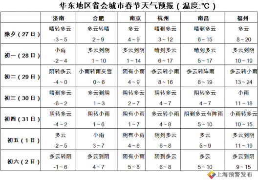 春节前期(27~28日),华东大部多云天气为主,28日夜间受低压槽影响,华东中部沿海地区有雾;29~30日一股强冷空气自北向南影响华东大部,有6~10℃的降温和小雨过程(苏皖中北部地区有雨夹雪或冰粒),并伴有4~6级偏北大风;假日后期(2月1~2日),冷暖空气交汇于江淮流域,华东中部地区多阴雨天气。