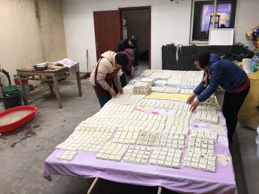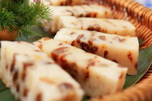 吕巷白龙糕,顾名思义就是糕上有一条白龙形状的花纹。制作这种糕点,要经过磨粉、筛粉、制馅、上蒸、刮粉、压洞、装馅、洒粉等多道复杂工序,而且对火候控制、蒸制时间的要求也非常严格,稍有不慎,取下“糕蒸”时,就看不到活灵活现的小白龙。吕巷白龙糕已有上百年历史,如今除了金山人过年会吃,还会销售到市区甚至海外,每年过年都是供不应求。品尝完金山带来的白龙糕,奉贤打着饱嗝说:“白龙糕和我带的这个方糕挺像。在我家,年初一到年初三,很多家庭都喜欢做方糕吃。精糯米、精粳米各一半,混合打成粉,用16眼罗筛成糕粉,用特制刮板取坑,填上豆沙,再盖上糕粉,用花模压实,切成4厘米边长小块,共16块,上笼旺火蒸熟,就成了方糕啦。”