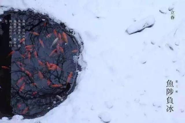 再过五日,河里的冰开始溶化,鱼开始到水面上游动,此时水面上还有没完全溶解的碎冰片,如同被鱼负着一般浮在水面。