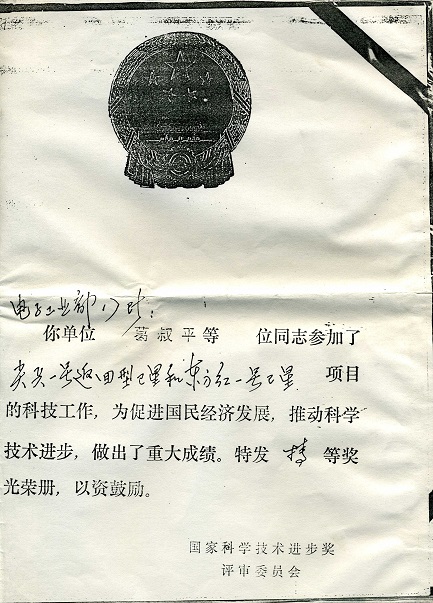 父亲去世后研究所在悼词中说,据不完全统计,父亲一生先后参加了一百多项重大尖端军事工程的研制工作,获得了26项科研成果,填补了不少军事科研的空白。其中获得国家科技进步特等奖的有:由国防科工委1987年评定的《原子弹和氢弹的突破核武器化》和《尖兵一号返回型卫星和东方红一号卫星》2个;个人荣立一等功1次,二等功4次,三等功1次,总部通令嘉奖一次;享有国务院特殊贡献津贴。
