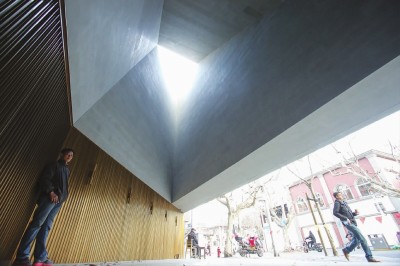在观众可观察到的剧场空间里,设计师分别开了四个大小不一,几何状的天窗。其中有三个出现在大厅的天花板上,在不规则的墙体的视觉指引下,这些天窗拉伸了剧场的纵深度,自然的光线稳稳地在这些几何造型上做着“光影游戏”。