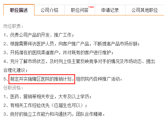 每日经济新闻(微信号:nbdnews)记者查询一些招聘网站近期的医药代表招聘信息发现,“负责公司产品的销售及推广”等字眼仍然出现在职位描述或岗位职责中。