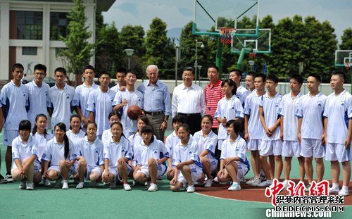 2011年8月21日,时任国家副主席习近平、美国副总统约瑟夫拜登参观汶川地震后重建的都江堰青城山高级中学。中新社发刘忠俊摄