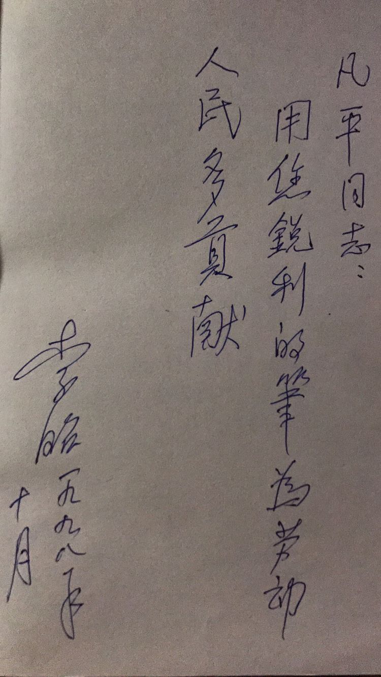 这些年,好像来家拜访的客人特别多,人们似乎没有忘记胡耀邦,因为在中国改革开放的进程中,也刻有他鞠躬尽瘁的足迹。李昭送我一本近年出的新书《胡耀邦与平反冤假错案》,我怦然心动,气宇不凡的耀邦又浮现在眼前,我恳请李昭在扉页上留几个字。李昭一口允诺提笔写下这样一行赠言:凡平同志,用你锐利的笔为劳动人民多贡献。