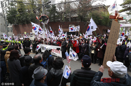 朴槿惠支持者私邸前聚集 插国旗鲜花表支持