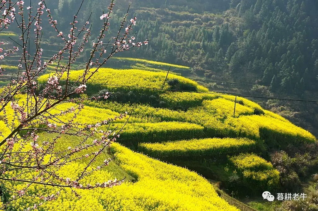 满坡满山的油菜花随着山势起伏、叠放,一层一层的从山脚漫向山顶,把整个山坡勾勒出美妙的曲线。时有开放的桃花点缀期间,鲜嫩的红色更衬出油菜花黄色的壮观。