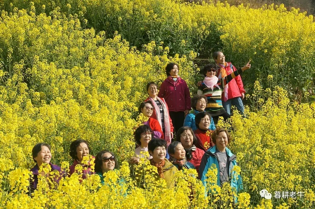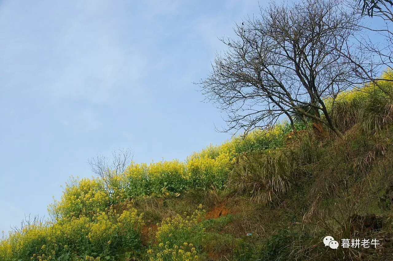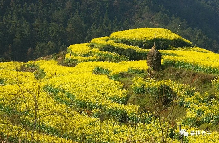 沿着指示牌我们向景区走去,才登上山路,我就被眼前的景色惊呆了:这是怎样的一片黄呀!满眼满眼的,满坡满坡的,满山满山的,都是油菜花组成的黄色,小树、气象台、茅草房、电线杆只是它们的配角和点缀。当然还有那些新建的农舍,只在这一大片的金黄中露出它们些许的真容;袅袅的炊烟也在这片片的黄色中飘散,享用着从大山背后射出的缕缕阳光。于是脑中立刻跳出了那句名诗:“满城尽带黄金甲。”只是这里不是城市!