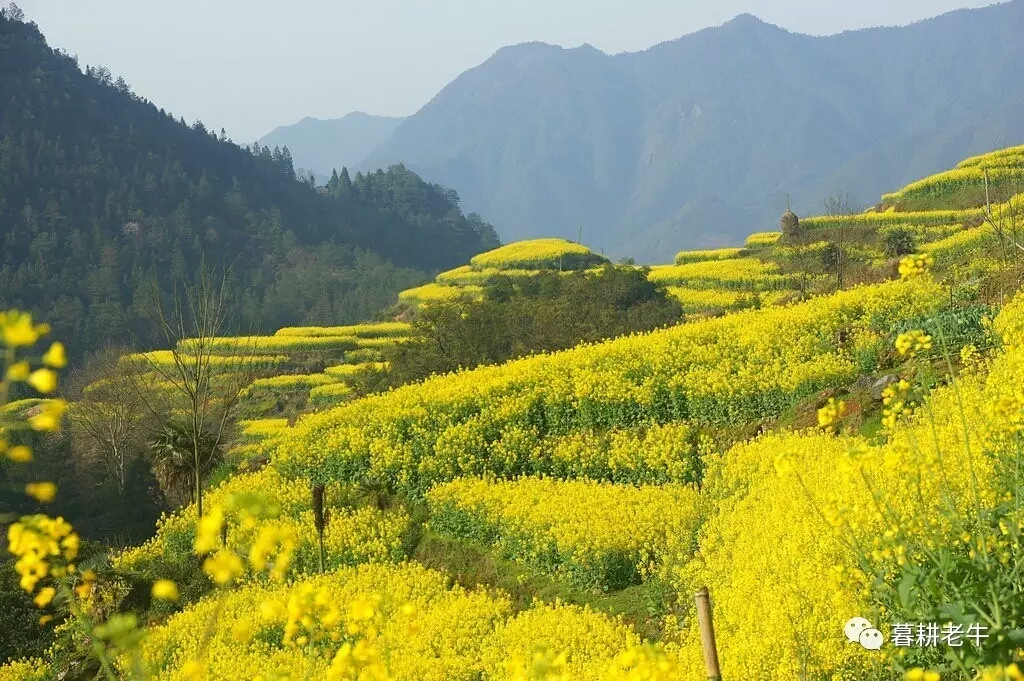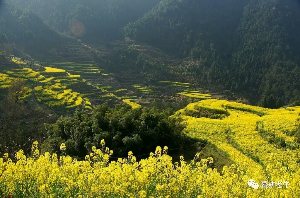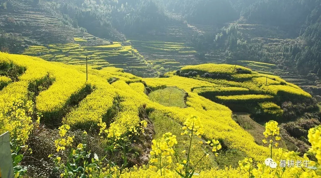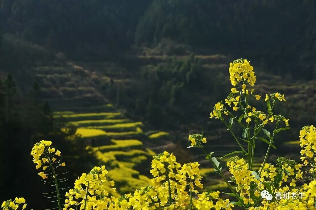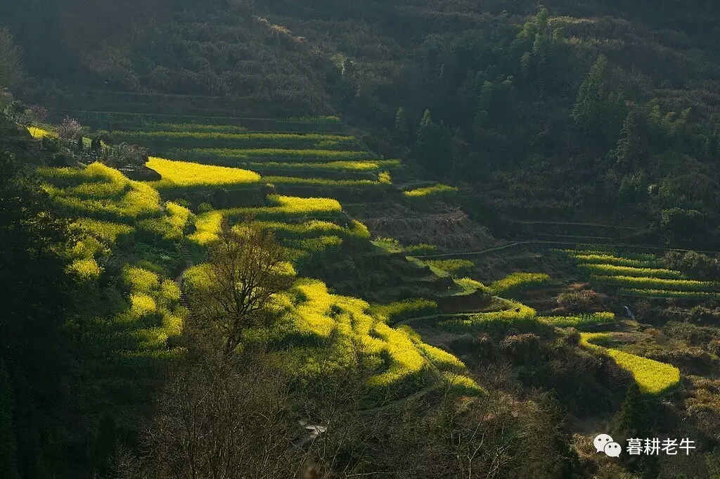 放眼对面的山坡,一层层的梯田被这黄色画出了分明的层次,在晨光下或明或暗的,层层叠叠,曲曲弯弯,如少女美丽的曲线。透过晨光照射下的金色、透明的油菜花,可以望见远处的大山,甚至山坳里那点点的屋舍。