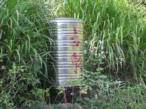 这是房主人建在屋子背后山坡上的水箱。不锈钢铝合金材质,约有一个柏油桶大小。水是从山顶上泉眼那里接上水管流过来的。