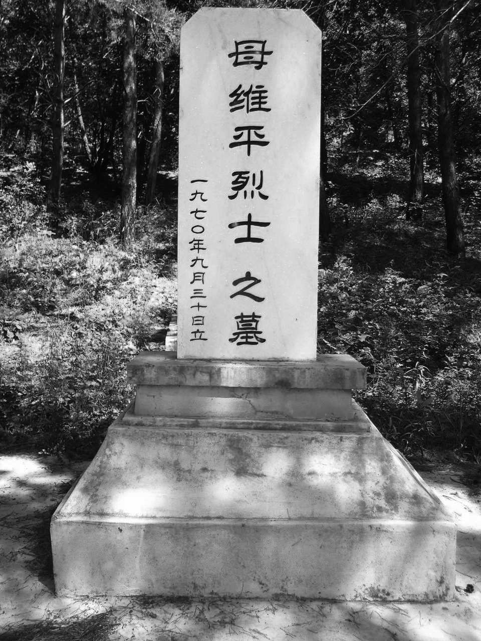逊克军马场在距12队不远的东山上,为母维平修墓立碑。墓碑高2米,象征着母维平20岁的青春年华;墓穴呈马鞍形,象征着母维平热爱的军马事业;四周环绕的铁链,象征着知识青年和马场人永远心心相连;墓地前后共栽下了69棵松树,既代表了母维平下乡的1969年,又是6月9日他牺牲之日的纪念。