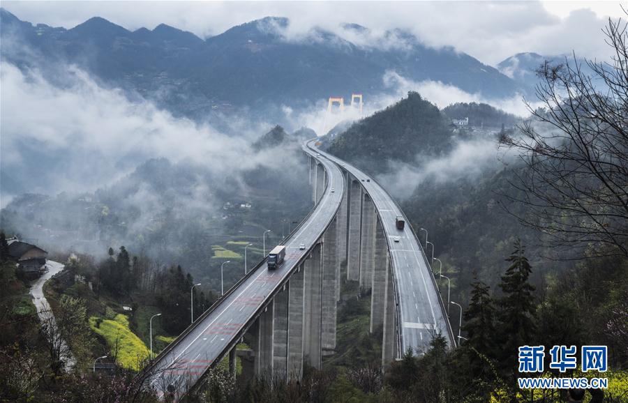 4月4日,一场春雨过后,位于湖北省恩施土家族苗族自治州境内的沪渝高速泗渡河大桥周围云雾缭绕,宛如仙境。