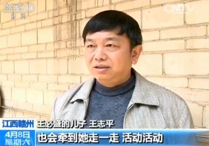王必盛的儿子王志平:达不到那种默契感,有的时候我们作儿女的回来,也会牵到她走一走,活动活动,但是我们的力平衡不了,我牵着我母亲走,曾经摔过三次,摔倒地上,但我父亲牵着她,她们之间配合的非常默契,一脚都不能离开。