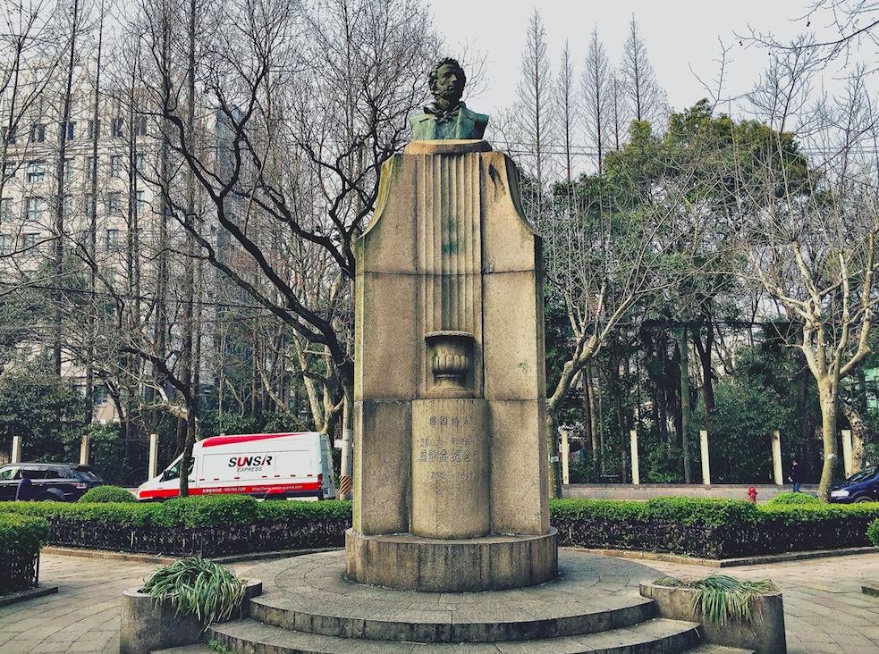 不过,要说岳阳路上最有名的“人物”,应该是这位外国人——俄罗斯大文豪普希金。岳阳路最北端与汾阳路、桃江路交汇,三条路合围成了一个三角地带,中心是一座普希金铜像,周围有花园小路,这座小花园也被称为“普希金广场”。
