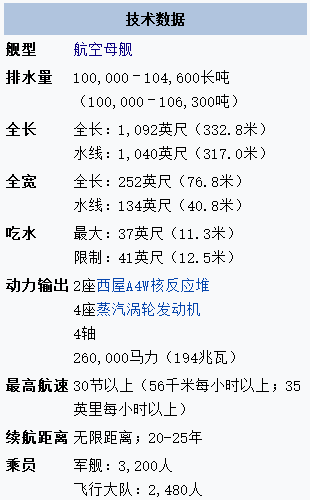 福特级航母的主要技术参数如下: