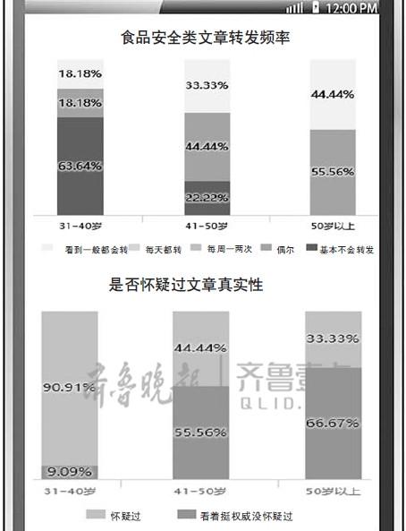 济南心理卫生协会副会长张洪涛认为,中老年人普遍关注食品安全问题,而转发这些内容的人则是出于一种求关注、求交流的心态,想用新奇有用的信息来与他人产生交流。调查问卷中,50岁以上的人中88%都表示关注食品安全,41岁至50岁的人中也占了39%,年轻人则在14%左右。