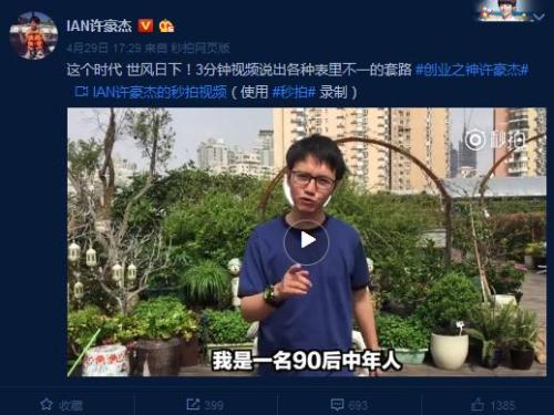 许豪杰在视频里称自己是“90后中年人”。截图来自许豪杰微博