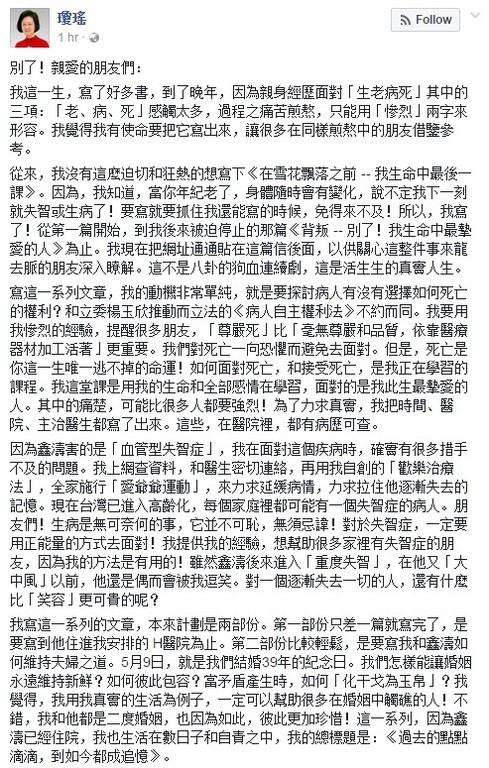 我亲爱的朋友们,这次关闭脸书,和以前不同!以前我总会告诉你们:“珍重再见,后会有期!”可是,这次是“珍重再见,后会无期”了!请你们体恤我,当我的“最后一堂课”,变得如此不堪,我还有什么心情和大家交流呢?看到脸书上还有新来的朋友,告诉我:“琼瑶阿姨,我刚刚为你加入了脸书……”我真的很心痛!我对不起你们,对不起那么多深爱我的朋友!这声“珍重再见!”我打字时已经泪崩!