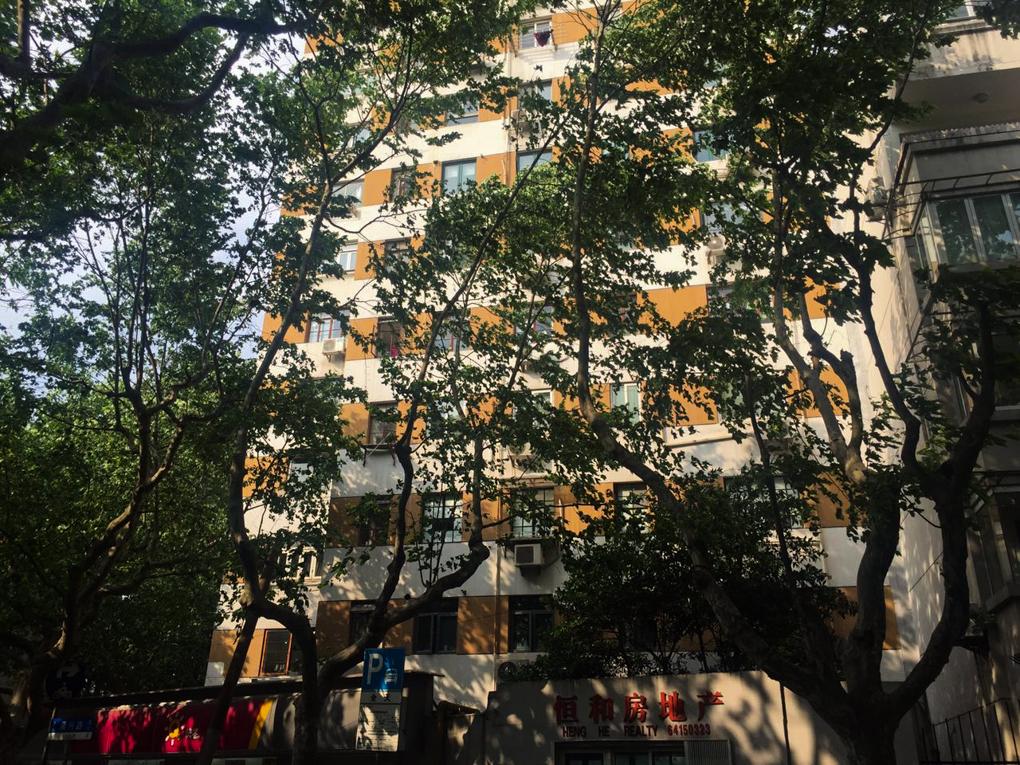 ▲吴兴路上梧桐树与居民楼“亲密接触”。舒抒 摄