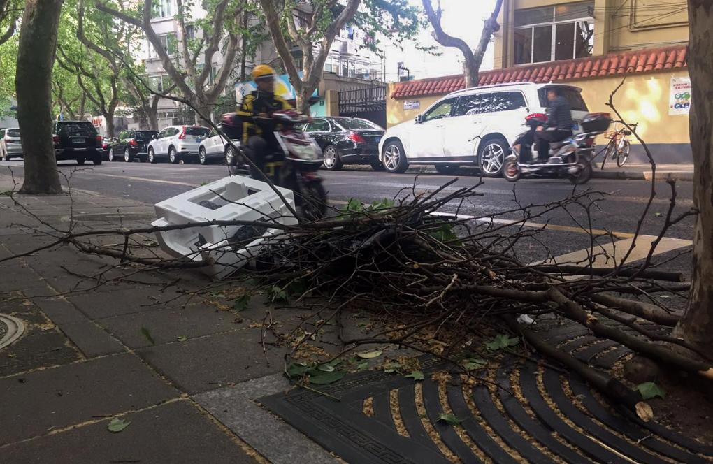 ▲吴兴路上路边零星堆放着修剪后的枯枝。舒抒 摄