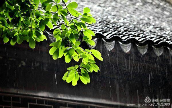 今人听雨,则不必坠入那满怀愁绪的情境之中。不过,独处仍 为听雨之佳境—— 梅雨时节,一茶,一书,一世界,只需临窗闲坐,听雨点敲打着窗棂,丁冬作响,看涓涓水流,顺房檐而下,敲打在树叶上,沙 沙低吟浅唱……