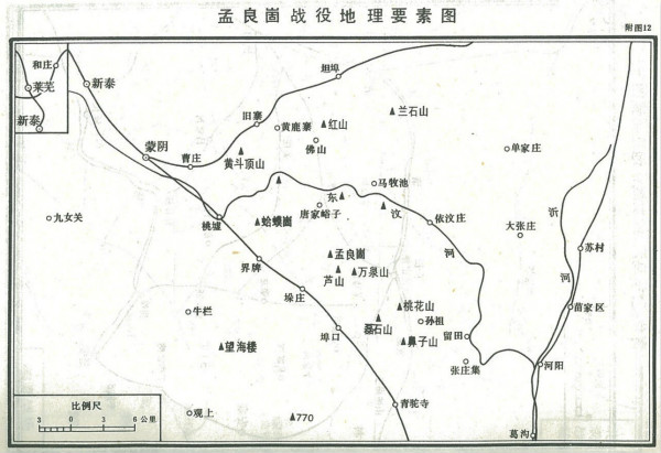 海拔575米的孟良崮是芦山山区的主峰,位于蒙阴县垛庄镇境内,属蒙山山系。相传宋朝杨家军将领孟良曾屯兵于此,故此得名。崮就是四周陡峭而山顶平坦的山头,孟良崮和附近的万泉山、雕窝等山峦都没有水源,和三国时马谡守的街亭一样,在兵法上属于毫无生路的绝地。而且孟良崮是石头山,石质坚硬,无法构筑坚固工事,如果炮火落在山上,石头崩裂,还会将火炮的杀伤威力进一步放大。