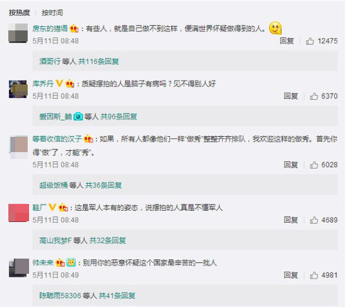 5月9日,一张武警战士在北京地铁站笔直站姿排队的照片在舆论场上传开,随后有声音质疑其为摆拍,引起社会关注。11日,当事方武警某支队回应称“我们一直都是这样做的”“当时站的已经很随意了”,网民纷纷表达理解与赞赏,斥责“键盘侠”为“键盘瞎”。
