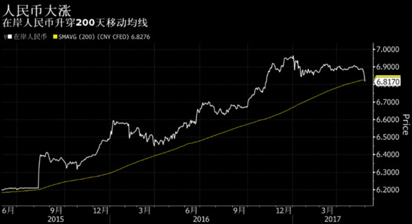 人民币升穿一技术点位,可能预示着后市还会进一步走强,在岸人民币升穿200天移动均线,为2015年8月份以来首次,离岸人民币目前处在200天均线上方大约1%的位置。