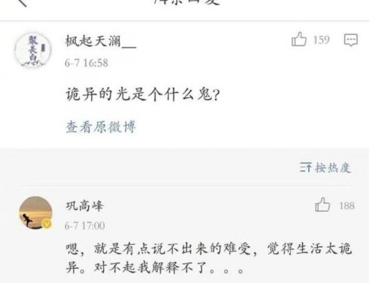 考试结束后,这套阅读理解题遭遇不少浙江考生“喊难”,而伴随着考生一头雾水,“诡异的光”以及文章原作者巩高峰随即走红。巩高峰在微博回复一名网友的提问时称“本来是搞笑的,谁知道有这么一出”,随即被理解为“高考阅读打败原作者”,并被指其批判试卷出题人。
