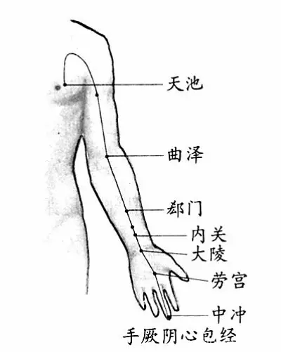 心包经主要有如下九个穴位,依照运行的线路依次为:天池、天泉、曲泽、郗门、间使、内关、大陵、劳宫、中冲。