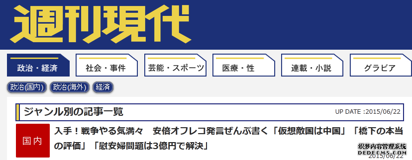 最新一期的日本杂志《周刊现代》爆料称,6月初,日本首相安倍和各媒体负责人在东京一家高级中餐馆“赤坂饭店”召开“恳亲会”。“恳亲会”就是安倍与媒体管理人员的一种联系会,要求媒体对其进行拥护性、支持性的报道。该杂志称,安倍当天在“恳亲会”上喝完自己杯中红酒之后,就开始连发惊人之语。谈及国会辩论、安保法案相关话题时,安倍开启“将自己学说强加给周围人”的模式,大力批判日本在野党的民主党党代表冈田克也,称其“总是说没有意义的废话”“民主党要完蛋了”等等。谈到集体自卫权时,安倍竟然放言称:“安保法案就是冲着南海上的中国。所以说了要做(指通过安保法案),那就一定要做。”安倍在媒体面前,“大大方方”地承认了自己的确在谋划和中国的战争。安倍还称,要行使集体自卫权并和美军一道,“敲打在南海上的中国”。