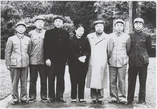1977年,萧华(左二)出席观看《长征组歌》 演出并接见歌唱家马玉涛等演职人员。 图片由中共一大会址纪念馆提供