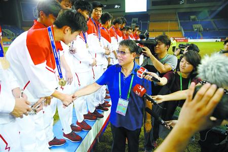 8月3日,全运会U18男足决赛上海2:1赢四川,徐根宝在颁奖仪式上向队员们表示祝贺。(均 视觉中国)