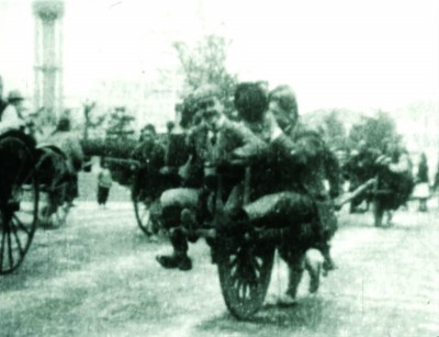 据上海音像馆采集整理,目前最早涉及苏州河的影像出现在1898年。这一年,美国汤姆斯•爱迪生电影公司派遣了一支远东摄影队来到中国,拍摄了一批关于香港和上海的素材,最后根据素材编辑成6部短片在美国发行。其中关于上海的有2部,《上海警察》和《上海街景》。在《上海街景》中,可以看到在苏州河以南地区往来的手推车、黄包车、自行车、马车,画面里还能看到马嘉理纪念碑和电灯柱(图①),这是迄今为止能看到的关于外滩和苏州河地区最早的影像。
