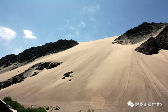 我不禁猜想,山的外侧,沙海该已到达了山体的什么高度?感觉只剩这荒凉的山峰,为抵御沙海的进侵在做着最后孤独的努力,但如果没有根本的生态环境的改善,这种抗争无疑也是徒劳和绝望的,失守是早晚的事——晚也晚不了多久了。而山体本身也是极其脆弱的,因日晒风化而剥落的石子、石屑已在山脚堆得高高的,它们下一步的命运就是变成新的沙粒和沙尘。