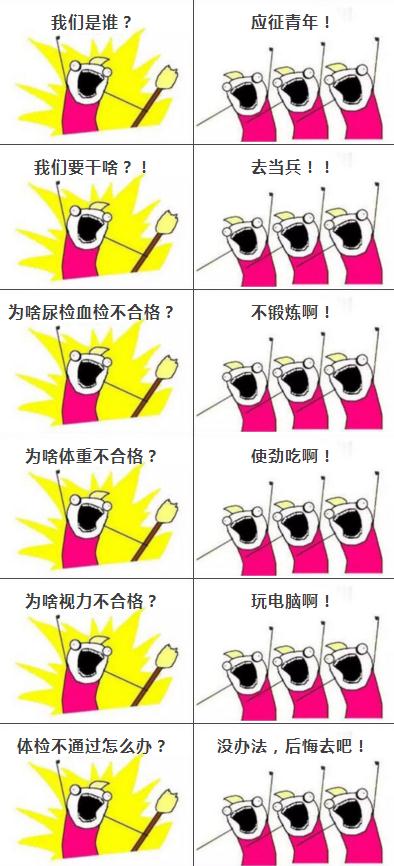 “征兵体检”给当今青年健康敲警钟 青少年是祖国的未来,民族的希望。 今天,军人要有灵魂、有本事、有血性、有品德。未来战场不需要弱不禁风的“小鲜肉”,而需要敢打必胜、体魄强健的铮铮硬汉,只有他们才能履行使命、保家卫国。 各地征兵体检工作渐入尾声。然而,关于征兵体检所引发的思考却不应随体检工作结束而结束,这是一个应引起全民关注的沉重话题。 今年征兵体检的淘汰率“爆表”啦! 在今年征兵体检中,各地上站体检人数较往年均有增加,但体检的“不合格率”却高得对不起观众。据了解,某市体检淘汰率竟然高达56.9%,着实令人咋舌。 眼看着十八九岁的大小伙子一串串折在了体检关上,不得不引发我们的深思。问题出在哪里呢?这一期我们就围绕征兵体检淘汰率偏高问题来找“病根”。 今年征兵体检十大问题: 某地级市体检数据显示,主要有以下问题: 问题一,血检、尿检不合格,转氨酶过高占不合格人数的17%,血小板积压、尿酸、尿酮超标占不合格人数的28%,主要是肝胆肾功能受损、脂肪肝等。有专家认为原因是饮水少或长期饮用汽水、可乐、含甜蜜素等化工产品的饮料,食用含酒饮品、火锅、膨化食品等引起,饮酒过度,熬夜过度。 肝胆肾出现问题,比如非病毒性肝炎转氨酶超标,虽然不是传染病,不影响其他战友,但在高强度训练工作下,会加快肝脏损伤,甚至导致急性肝昏迷和其他并发症。 建议适龄青年减少碳酸饮料、不洁外卖和膨化食品食用量。 问题二,视力不合格,占不合格人数的46%,双目视力低于4.6的占三分之二,散光、斜视占三分之一,原因是不懂卫生用眼,疲劳用眼和长时间看手机。 视力不合格,上战场就打不准敌人,甚至成为敌人的靶子。 建议减少对手机等电子产品的依赖,养成卫生用眼习惯。 问题三,体重不合格,占不合格人数的20%。虽然体重有所放宽,但超重青年有增无减,主要原因是生活不规律、饮食不科学、锻炼不积极、肥胖带来的高血脂、高血压等并发症也相应增加。 身体肥胖的人也不能当兵,青年一入伍便扛起了卫国重担,军人要执行任务,翻不了高墙,跑不了步,扛不起武器,耐不了奔袭,如何打胜仗? 建议控制饮食,加强锻炼,养成健康生活习惯。 问题四,男性精索静脉曲张不合格,占不合格人数的8%,多数轻度曲张,少数重度,原因是长时间“葛优躺”、久坐打电脑游戏、手淫过度,运动量少等有关。 精索静脉曲张,在潜水、空降、冷热交替潜渡时容易产生血管暴裂和静脉窦形成等,造成器官急性炎症、急腹症等,甚至因强化训练造成不育症。 建议多运动,穿宽松衣裤,养成科学健康生活习惯,早检查早治疗。 问题五,心脏、血压不合格,占不合格人数的13%,心律不齐,早搏,RT波改变的心脏供血不足,血压高,多由熬夜、运动不科学、心理素质差等引起。 隐性心脏病,高血压等病症,都难以胜任极限军事活动, 建议提前体检,早期介入对症治疗。 问题六,文身不合格,面颈部文身,着军队制式体能训练服其他裸露部位长径超过3cm的文身,其他部位长径超过10cm的文身,男性文眉、文眼线、文唇,女性文唇,不合格。 文身影响我军军容仪表,在战场负伤时难以迅速判定伤情和快速包扎缝合。 建议对青少年进行早教,防止盲目崇拜造成一生后悔,对已经文身的、面积不大的、不暴露于衣外的,可进行美容除痕。 问题七,耳鼻喉炎症不合格,主要病症有中耳炎,鼻炎(外鼻道炎、蝶窦炎、上额窦炎、筛窦炎等),半失音性咽喉炎,占不合格人数的7%,主要原因为感冒或耳道进水感染没有引起重视,没有治愈引发慢性炎症,从而久治不愈。 建议应征前一年进行抗生素药物根治。 问题八,腋臭、平底足不合格,占不合格人数的3%,此症为遗传性疾病。 腋臭等难以适应集体生活,或在作战中易暴露目标。 建议越早纠治效果越好,等到应征体检时为时已晚。 问题九,心理测试不合格,占不合格人数的1.6%,多为抑郁症、自闭症、双重性格症、强迫症和狂躁症,该心理问题大多很隐蔽,家人亲属习以为常或不以为然,通过电脑测试时会科学准确的暴露出来。 建议提前测试和看心理医生,进行心理干涉治疗。 问题十,地区病不合格,占不合格人数的3.4%,如大骨节病,足髁外翻,肘外翻,曲膝下蹲不到45度,结石牙,肝胆肾结石等,主要原因是当地水质不合格,长期饮用硬质水引起。 附:2017年应征公民体格检查标准
