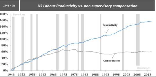 美国劳动生产率与非管理层工资水平变化曲线,下面为工资线